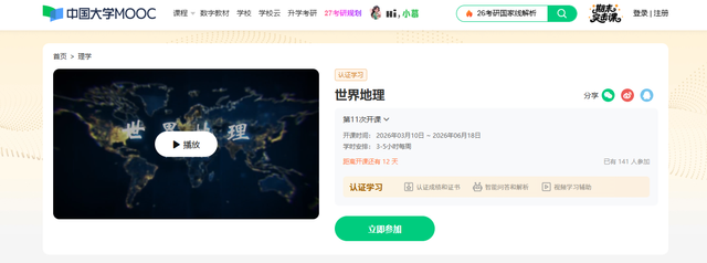 《世界地理》MOOC课堂第十一期将于2026年3月10日开课,欢迎大家加入!