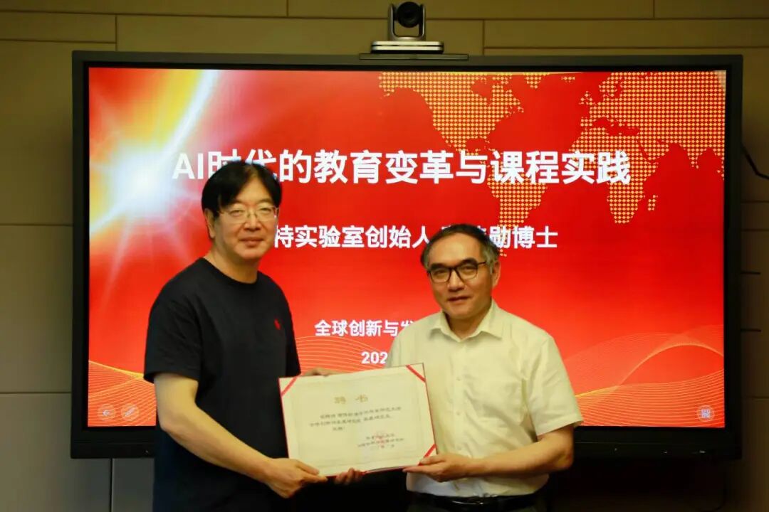 上述报告内容引起与会师生的强烈兴趣。李春兰副教授以及前来旁听的智能教育专业博士生与曹伟勋博士围绕AI教育课程搭建与目前国内教育进程的结合、重点关注课程设计还是软硬件自研等问题进行了热烈讨论。最后,杜德斌院长对曹伟勋博士的精彩讲座进行总结,并为曹伟勋博士颁发全球创新与发展研究院客座研究员聘书。